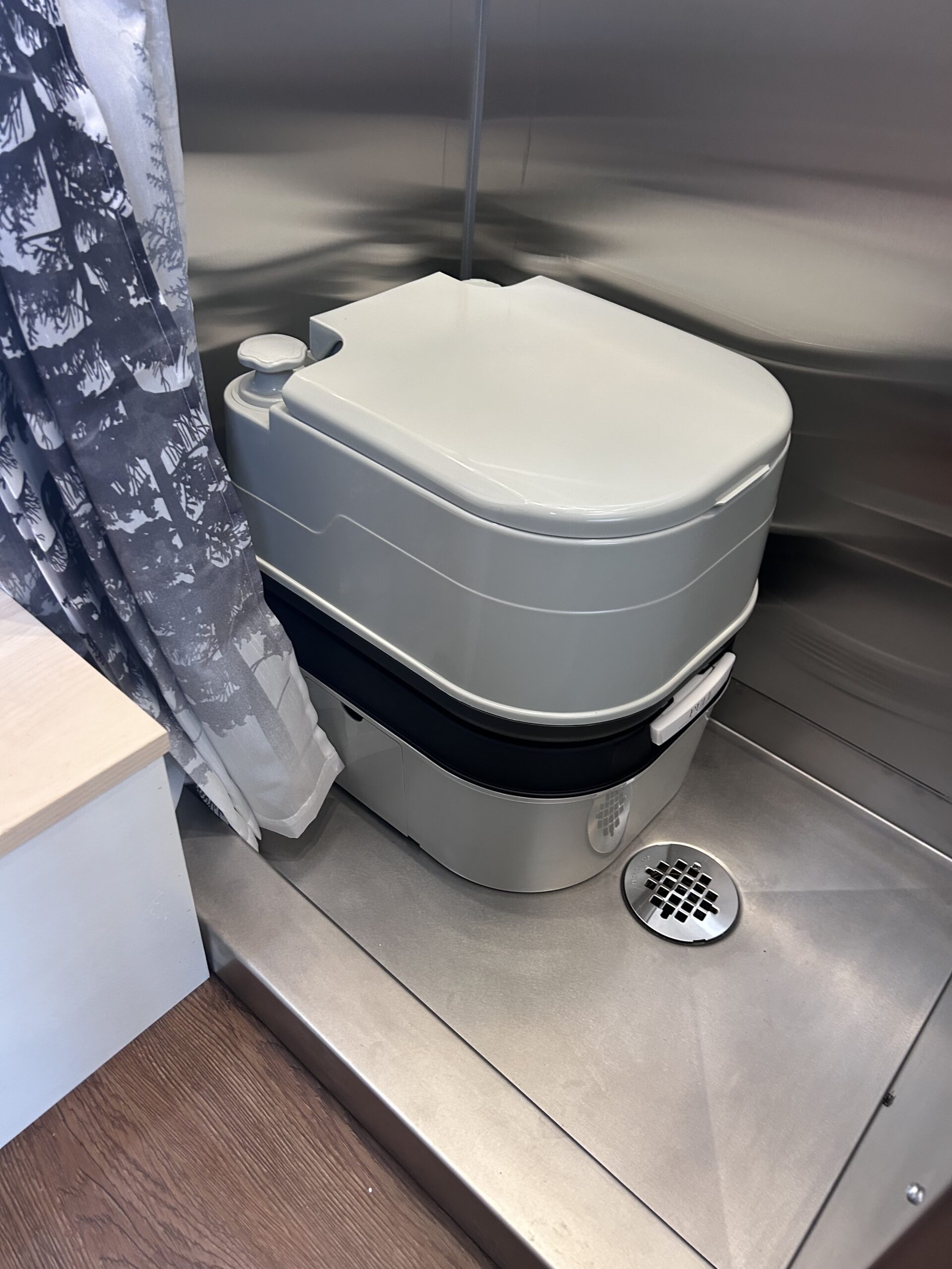 Portable toilet that fits neatly into the shower.