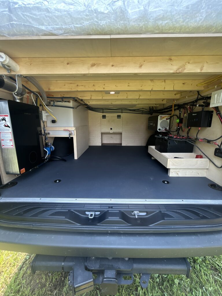 Tonnes of storage. Under the bed is a massive space for toys and equipment. Upper cupboards line both sides of the van for easy access and to keep clutter hidden.