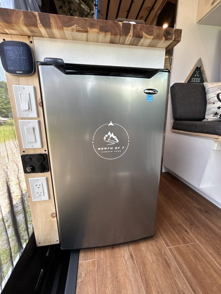 Frost free upright fridge with freezer. Easily accessible from inside or outside the van.