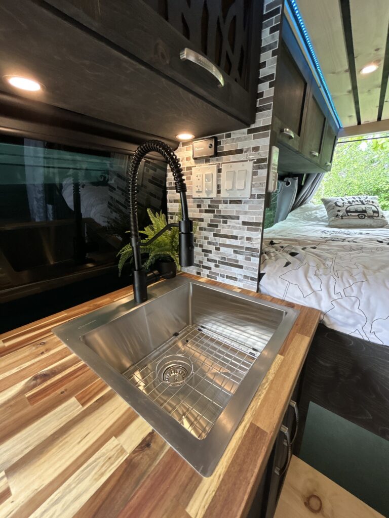 Full size stainless steel sink, with matte black pull down faucet.